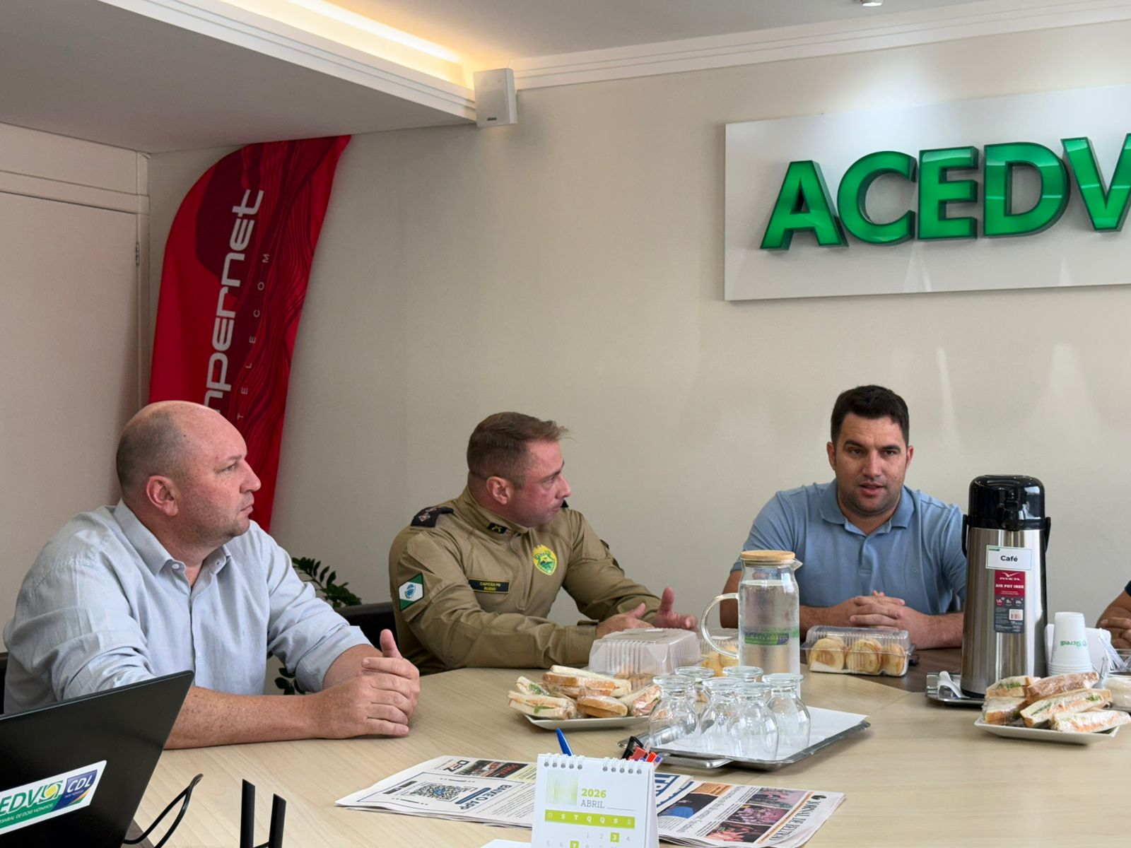 Na manhã desta quarta-feira, 4, a Casa do Empresário recebeu o comandante da 2ª Companhia da Polícia Militar, Capitão Bueno, para uma conversa sobre segurança pública em Dois Vizinhos. A solicitação partiu de alguns empresários locais e a reunião contou também com a presença de representantes do poder público, do Departamento de Trânsito de Dois Vizinhos (Deptran-DV), de conselhos comunitários ligados ao setor e empresas de segurança privada. “Vários empresários locais manifestaram preocupação com o aumento dos furtos registrados na cidade, o que afeta o funcionamento dos estabelecimentos comerciais e a tranquilidade da comunidade. O objetivo também é dar as boas-vindas para o nosso novo comandante. Buscamos, na conversa, indicar algumas medidas paliativas para que esses incidentes venham diminuir. Isso é um problema que vem, de certa forma, preocupando o empresariado e nós, como entidade, buscamos o bem-estar e com um bom andamento das atividades econômicas do município”, relatou Saulo Matos, presidente da ACEDV/CDL.