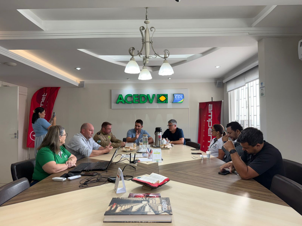Na manhã desta quarta-feira, 4, a Casa do Empresário recebeu o comandante da 2ª Companhia da Polícia Militar, Capitão Bueno, para uma conversa sobre segurança pública em Dois Vizinhos. A solicitação partiu de alguns empresários locais e a reunião contou também com a presença de representantes do poder público, do Departamento de Trânsito de Dois Vizinhos (Deptran-DV), de conselhos comunitários ligados ao setor e empresas de segurança privada. “Vários empresários locais manifestaram preocupação com o aumento dos furtos registrados na cidade, o que afeta o funcionamento dos estabelecimentos comerciais e a tranquilidade da comunidade. O objetivo também é dar as boas-vindas para o nosso novo comandante. Buscamos, na conversa, indicar algumas medidas paliativas para que esses incidentes venham diminuir. Isso é um problema que vem, de certa forma, preocupando o empresariado e nós, como entidade, buscamos o bem-estar e com um bom andamento das atividades econômicas do município”, relatou Saulo Matos, presidente da ACEDV/CDL.