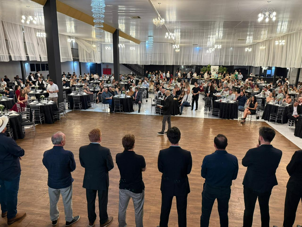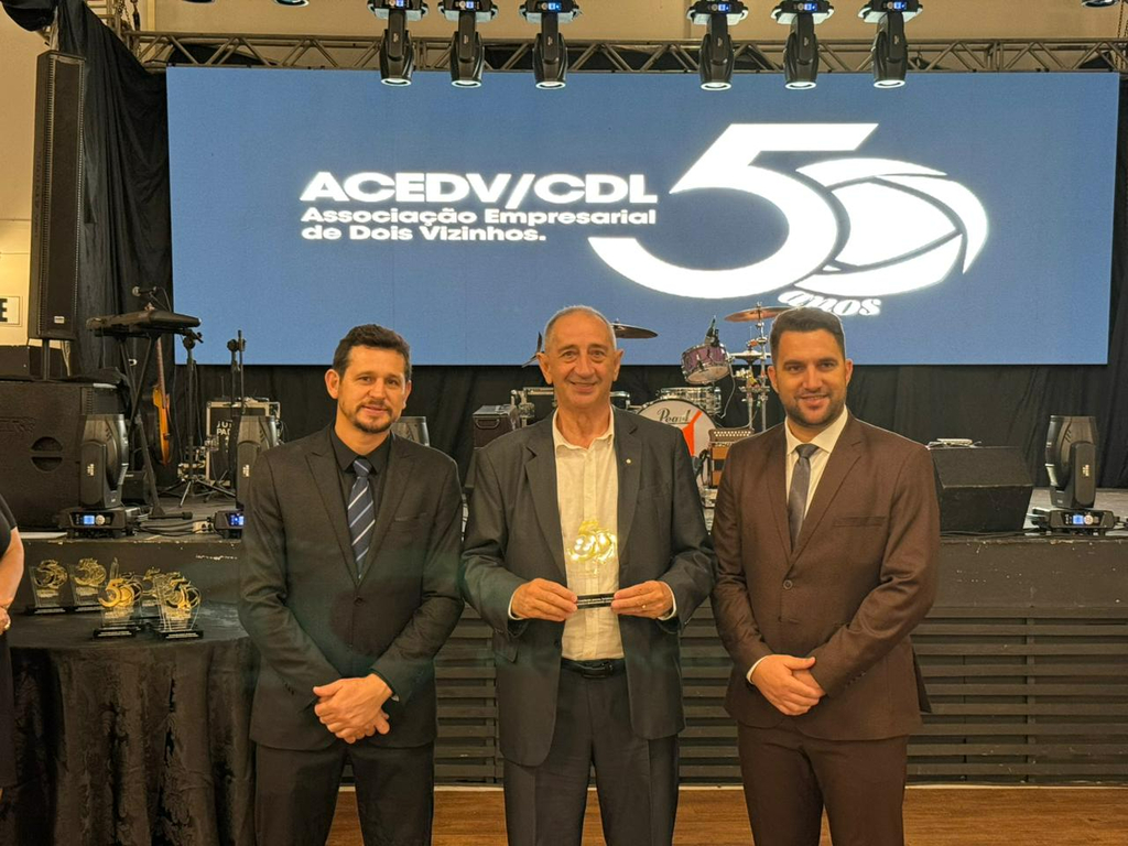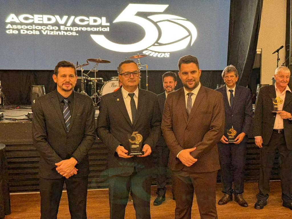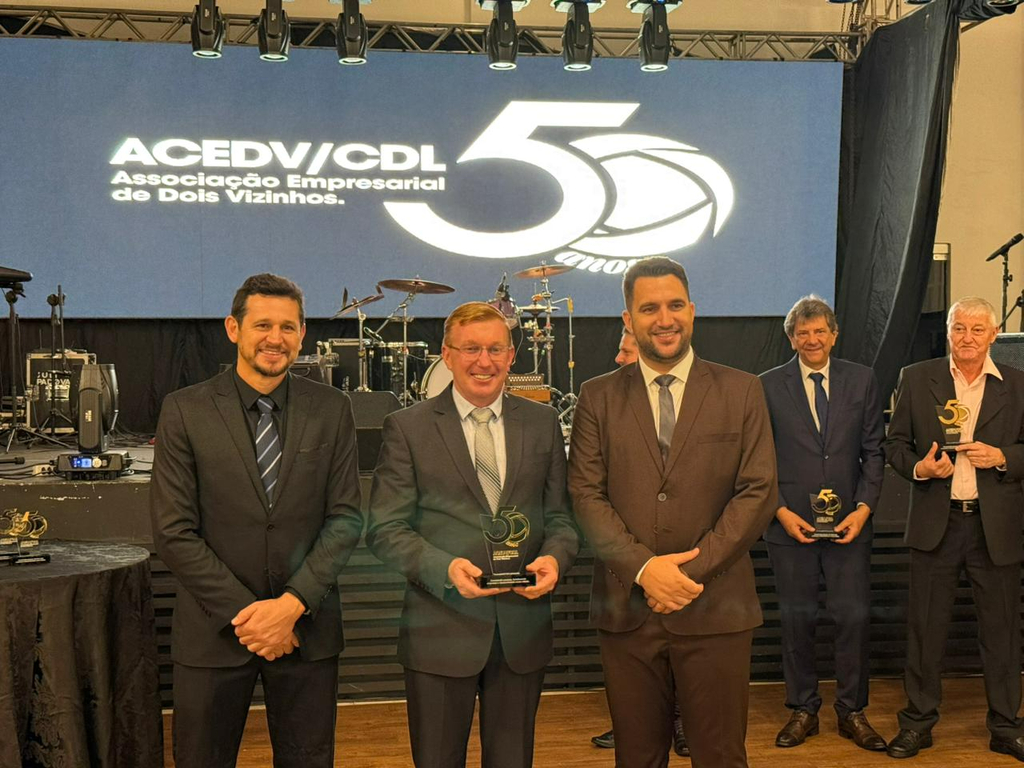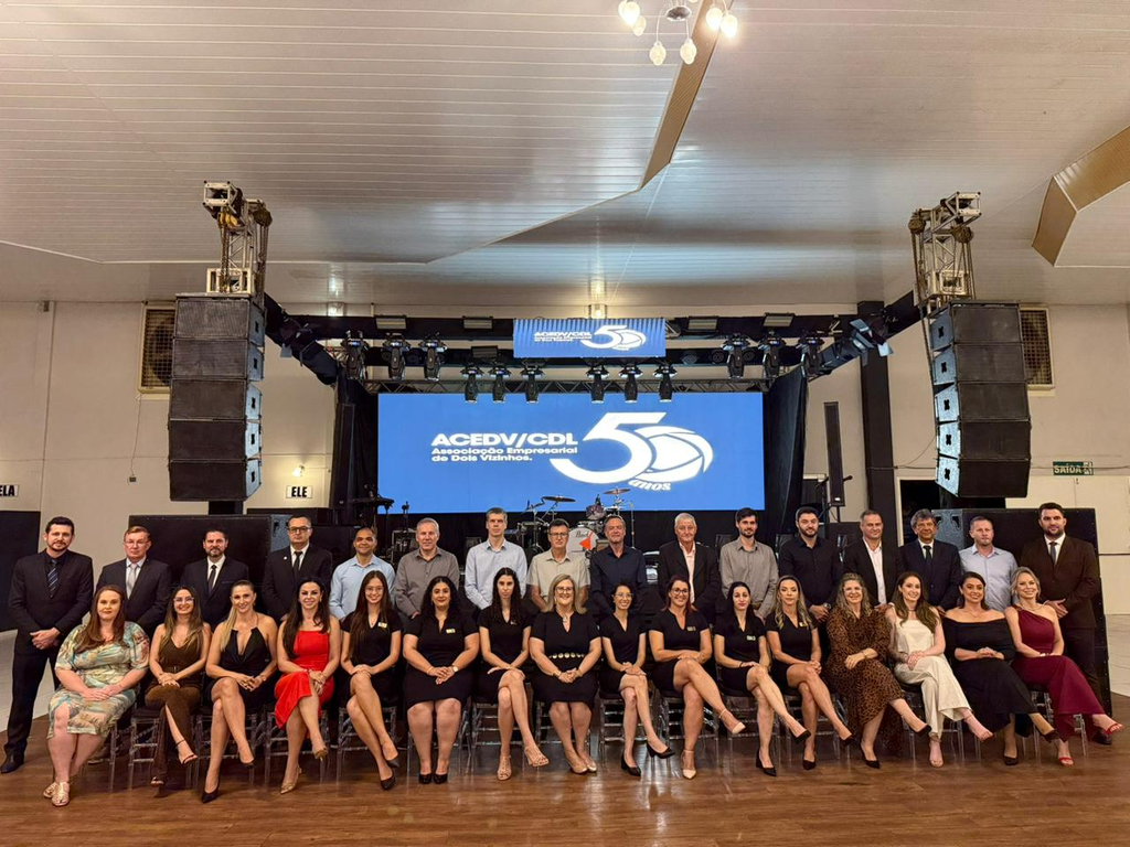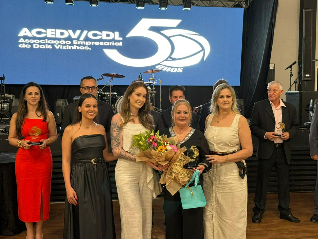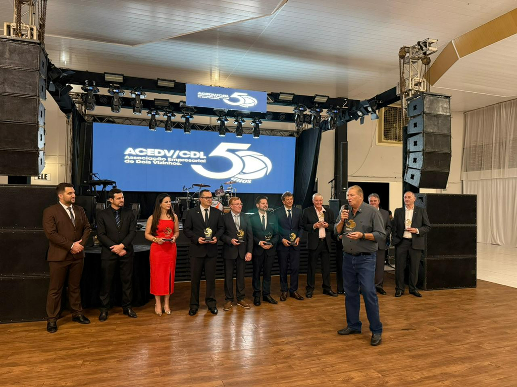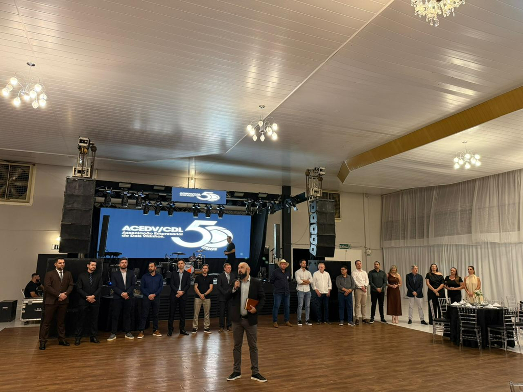 Um jantar de gala marcou a celebração do cinquentenário da Associação Empresarial de Dois Vizinhos (ACEDV/CDL), na noite desta sexta-feira, 24 de abril. A solenidade, realizada no Chaplin Centro de Eventos, foi marcada por homenagens a ex-presidentes e reuniu diversas autoridades, associados e convidados. A programação incluiu canto de parabéns com bolo, brinde com espumante e show musical de Júlio Padovani.