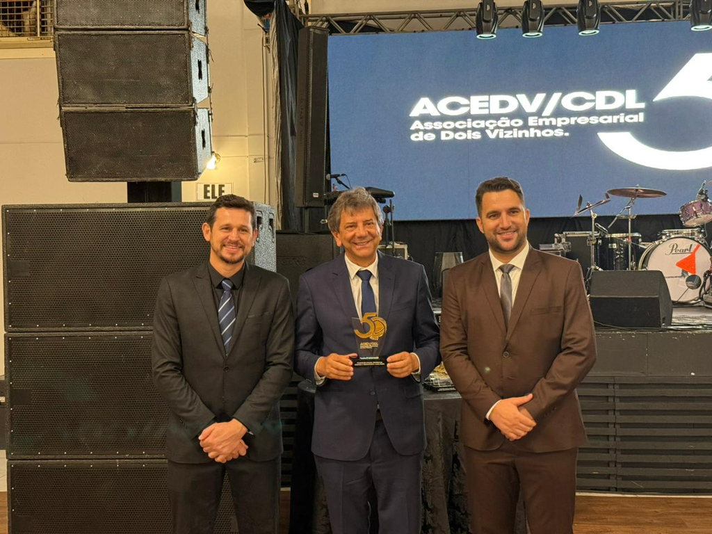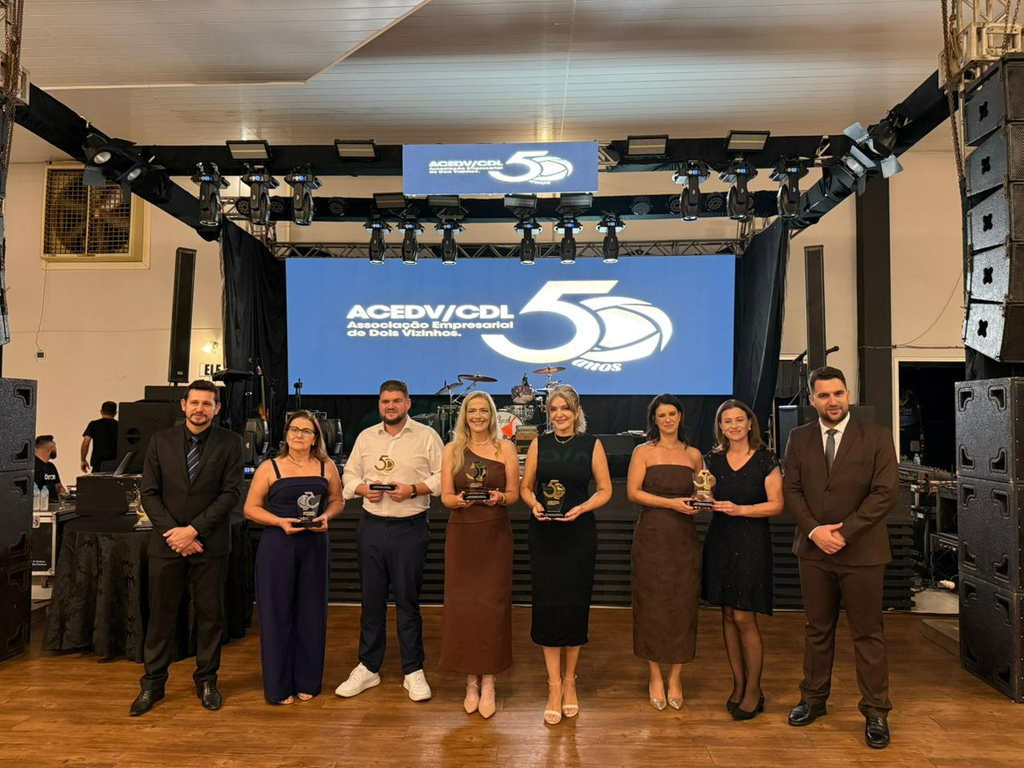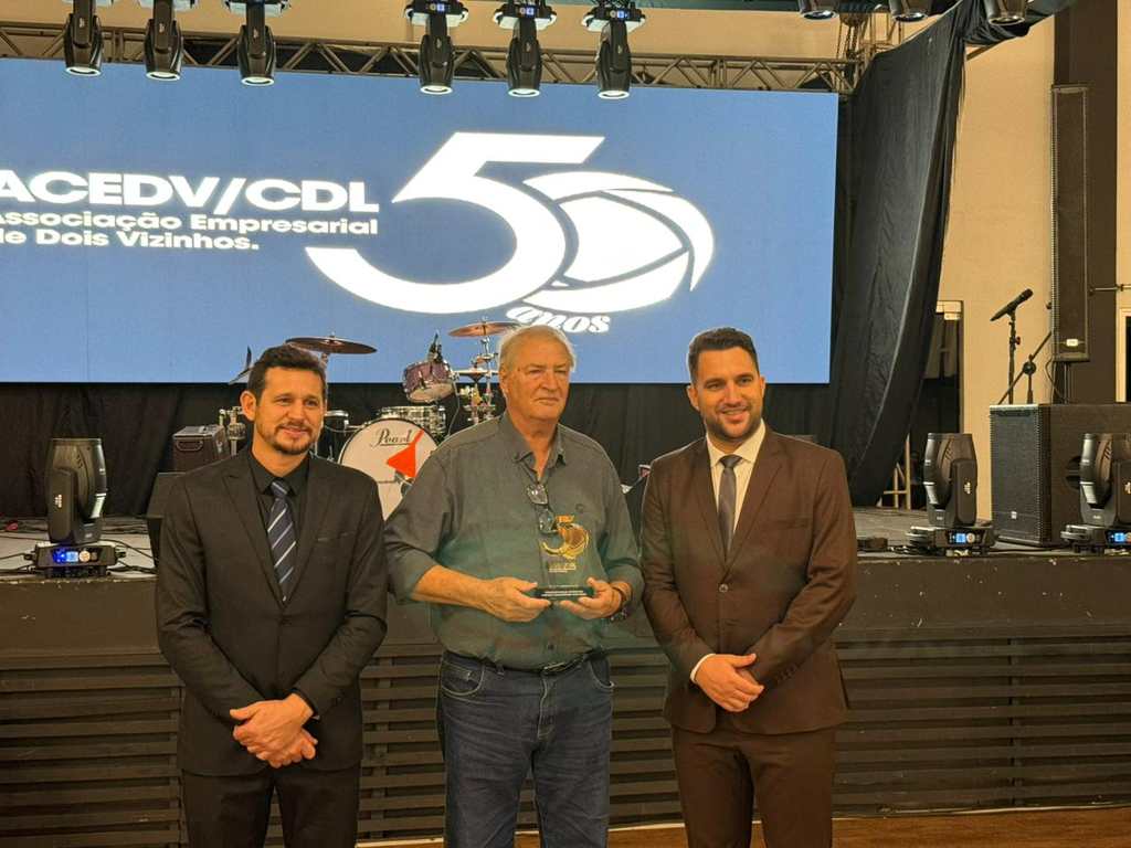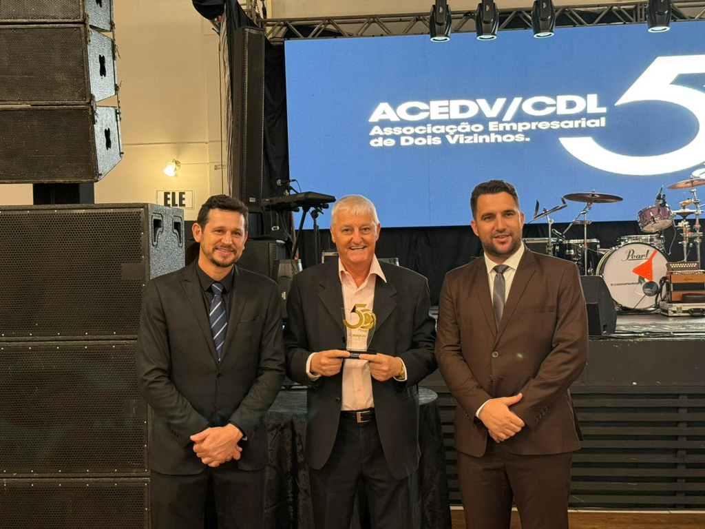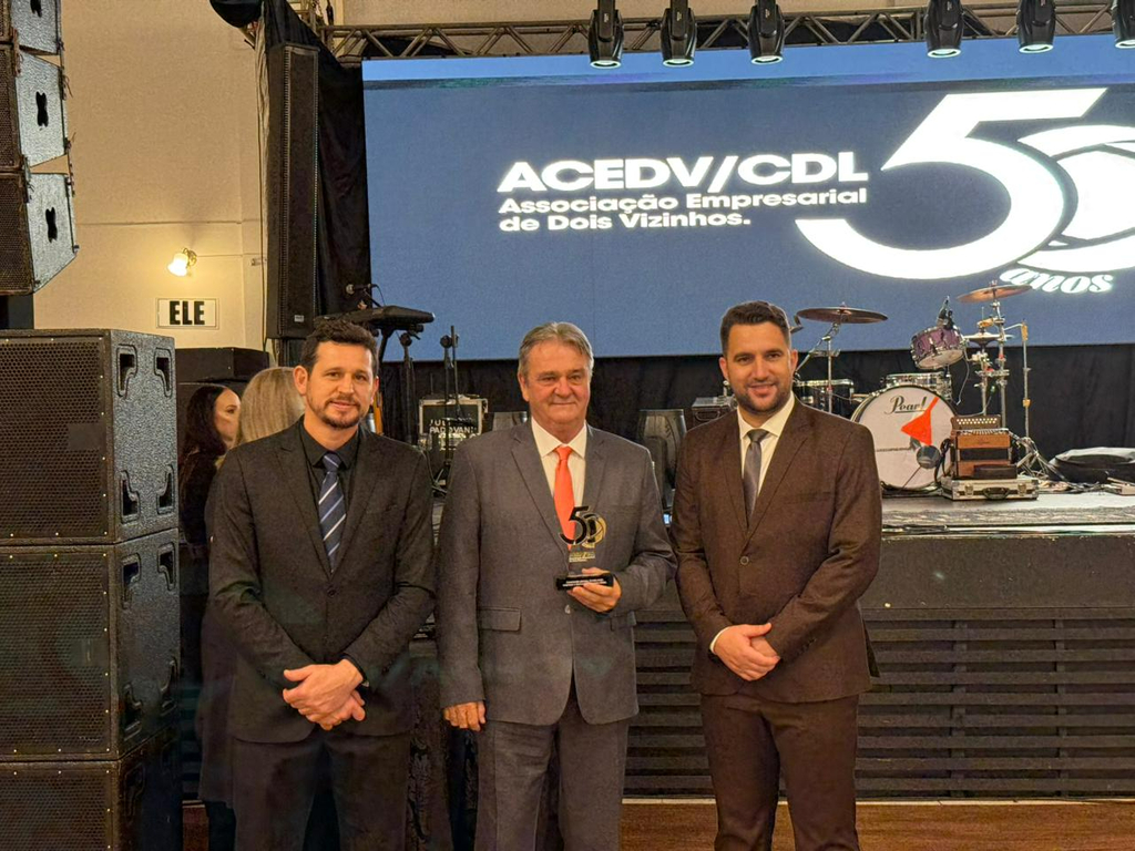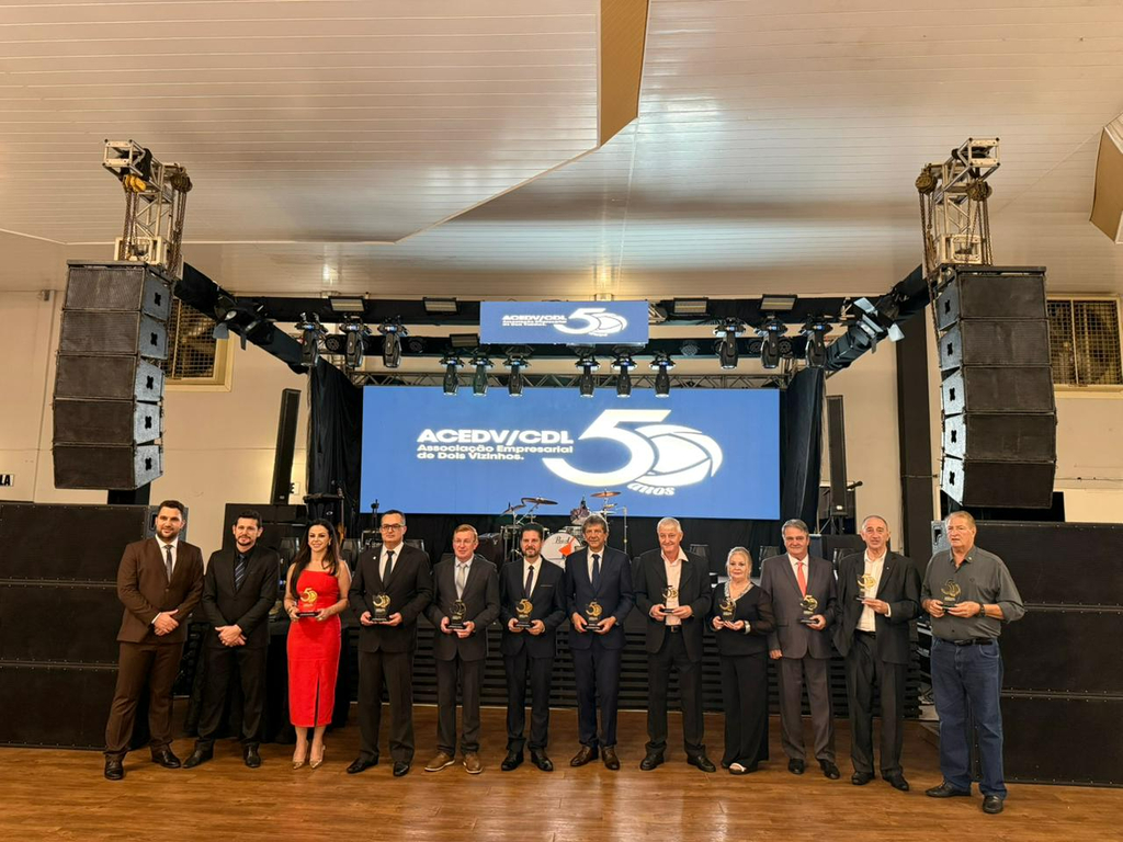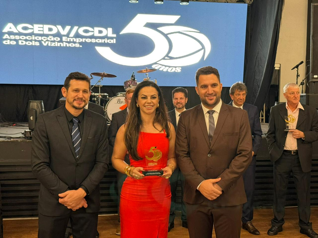 Um jantar de gala marcou a celebração do cinquentenário da Associação Empresarial de Dois Vizinhos (ACEDV/CDL), na noite desta sexta-feira, 24 de abril. A solenidade, realizada no Chaplin Centro de Eventos, foi marcada por homenagens a ex-presidentes e reuniu diversas autoridades, associados e convidados. A programação incluiu canto de parabéns com bolo, brinde com espumante e show musical de Júlio Padovani.