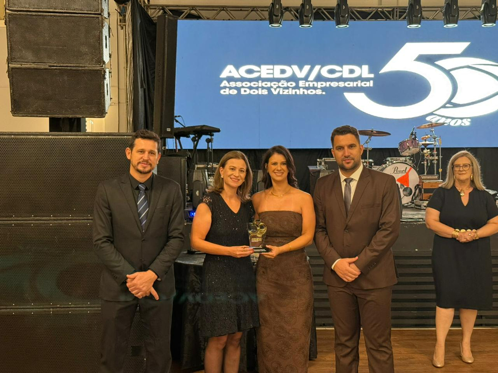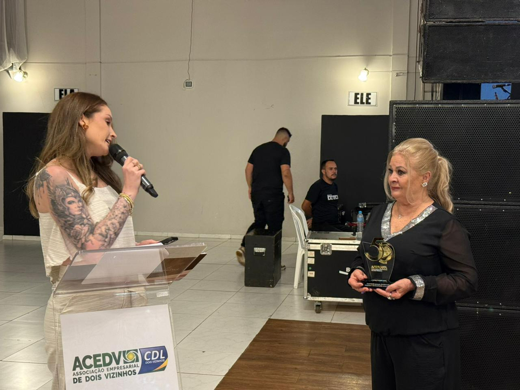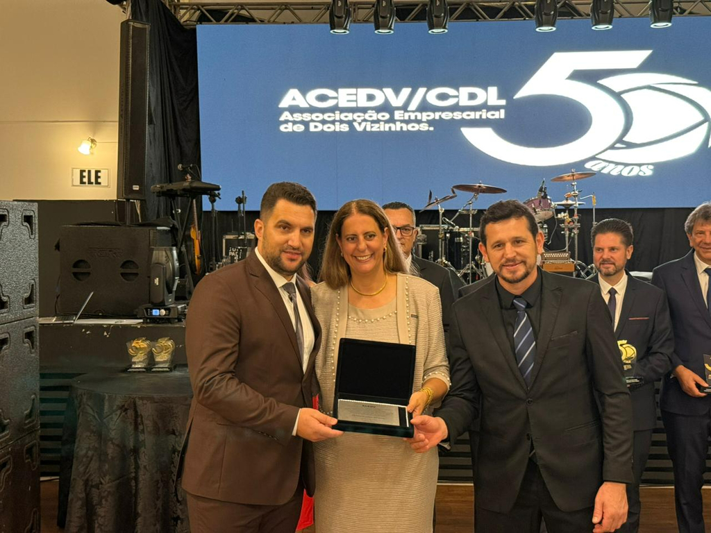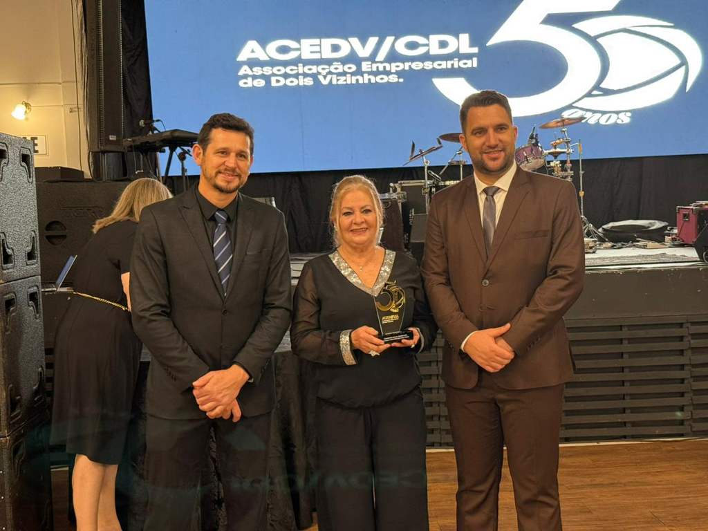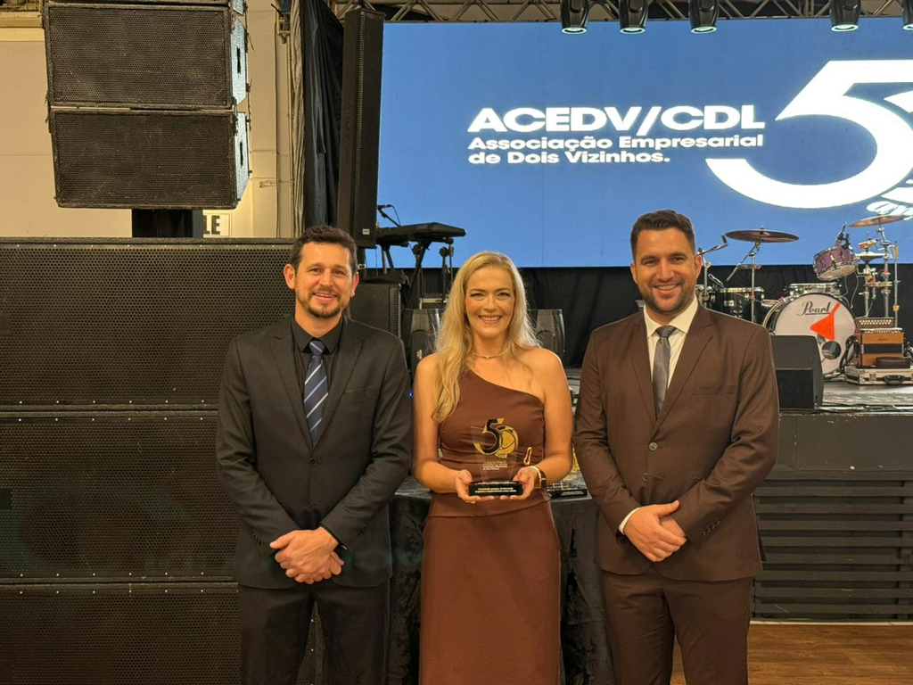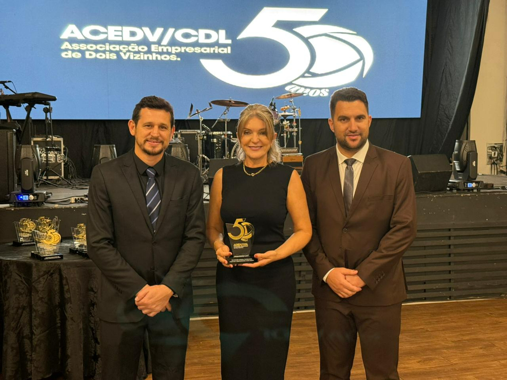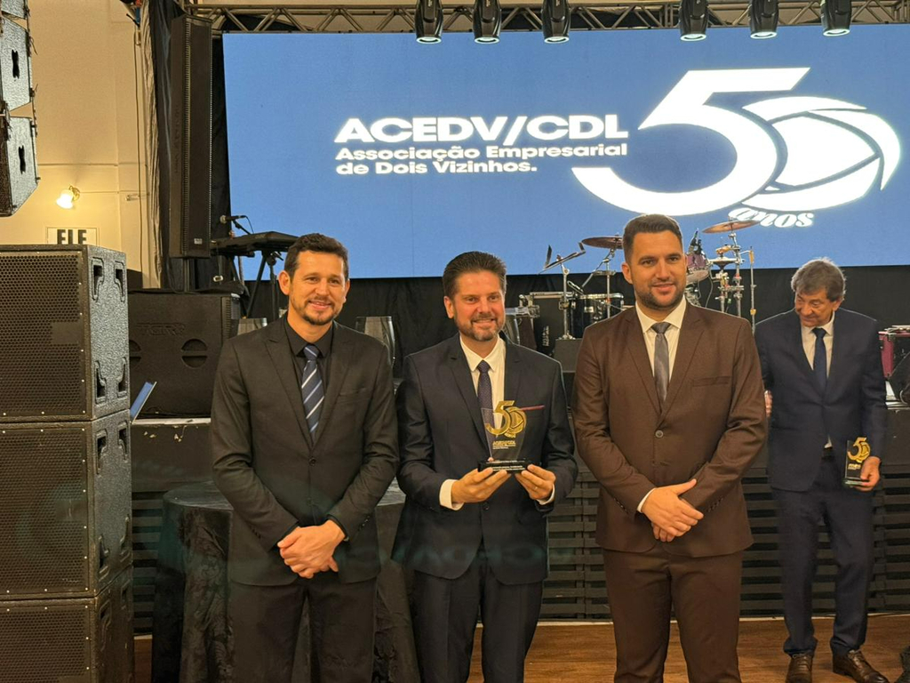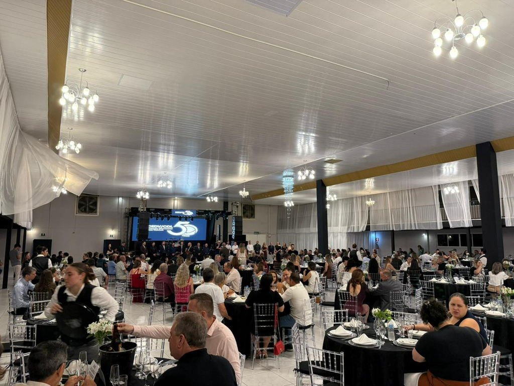 Um jantar de gala marcou a celebração do cinquentenário da Associação Empresarial de Dois Vizinhos (ACEDV/CDL), na noite desta sexta-feira, 24 de abril. A solenidade, realizada no Chaplin Centro de Eventos, foi marcada por homenagens a ex-presidentes e reuniu diversas autoridades, associados e convidados. A programação incluiu canto de parabéns com bolo, brinde com espumante e show musical de Júlio Padovani.