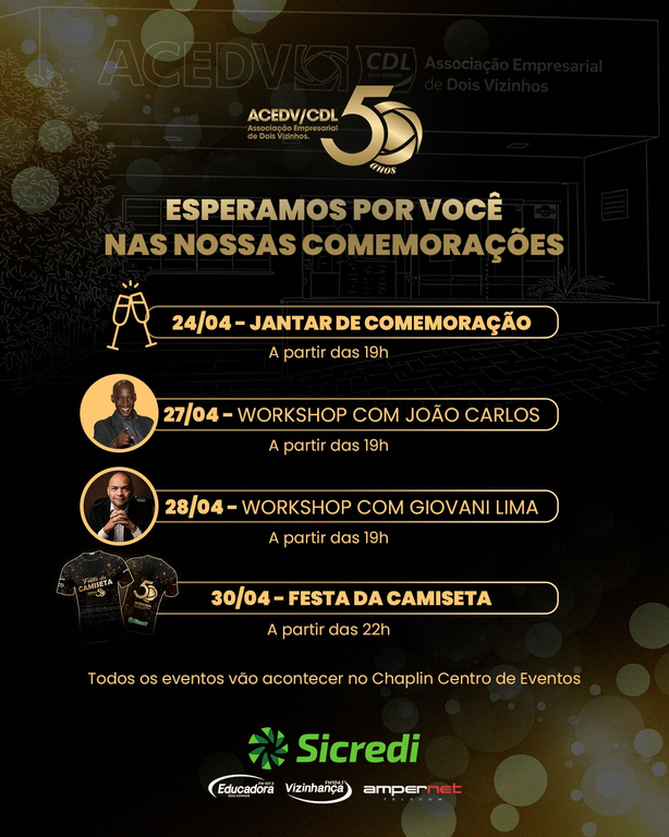 Nesta sexta-feira, 24, acontece o jantar de celebração dos 50 anos da Associação Empresarial de Dois Vizinhos (ACEDV/CDL). O evento será no Chaplin a partir das 19h. “Você empresário é o nosso convidado para fazer parte desse momento especial. Celebre conosco os 50 anos da ACEDV/CDL. São cinco décadas de trabalho, união e desenvolvimento, construindo uma história que faz parte do crescimento da nossa cidade e das nossas empresas. É uma trajetória feita por pessoas, empresários, parceiros e toda a comunidade que acreditou e construiu junto nossa entidade empresarial. Seguimos olhando para o futuro, buscando fortalecer, conectar e impulsionar os negócios”, disse o presidente Saulo Matos.