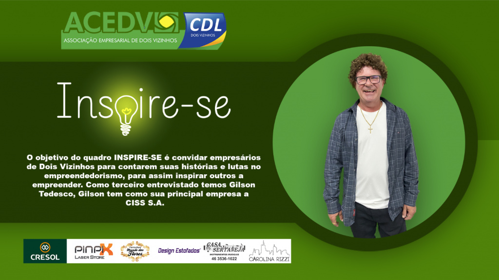 O objetivo do quadro INSPIRE-SE é convidar empresários de Dois Vizinhos para contarem suas histórias e lutas no empreendedorismo, para assim inspirar outros a empreender. Como terceiro entrevistado temos Gilson Tedesco, Gilson tem como sua principal empresa a CISS S.A.